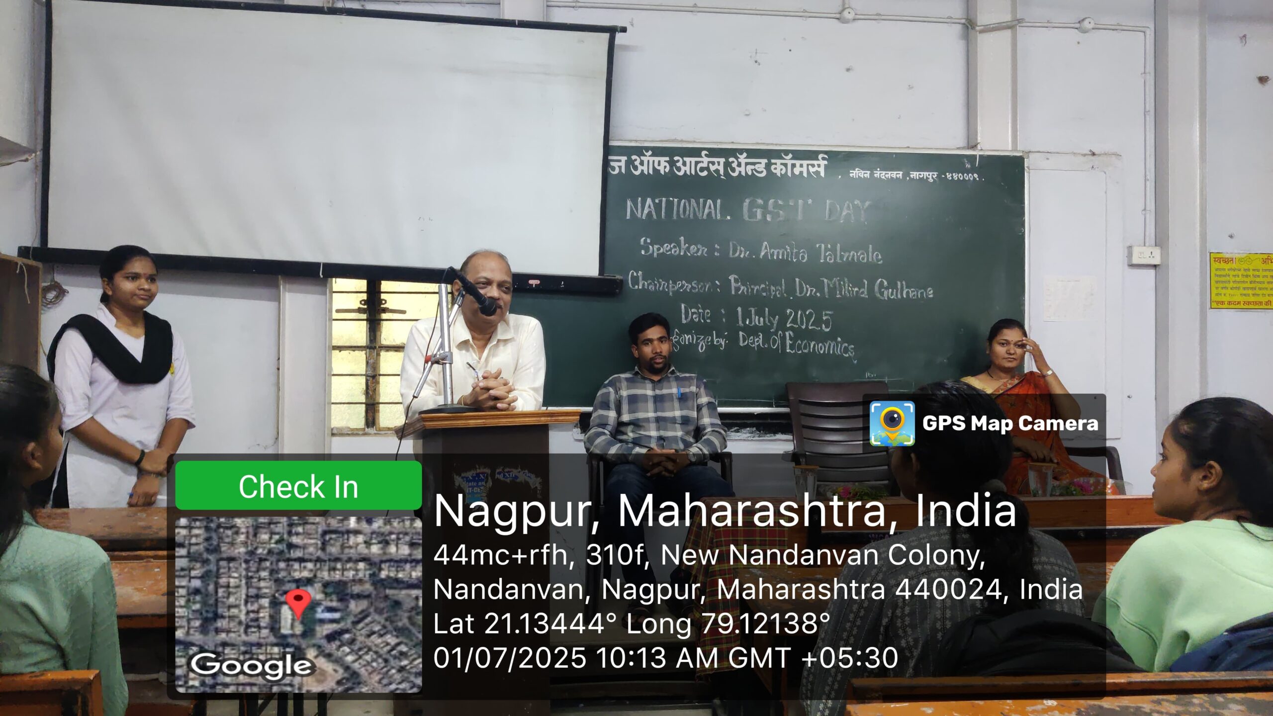 राष्ट्रीय वस्तु आणि सेवा कर (GST) दिनानिमित्त मार्गदर्शन करतांना महाविद्यालये प्राचार्य डॉ. मिलिंद गुल्हाने सर.